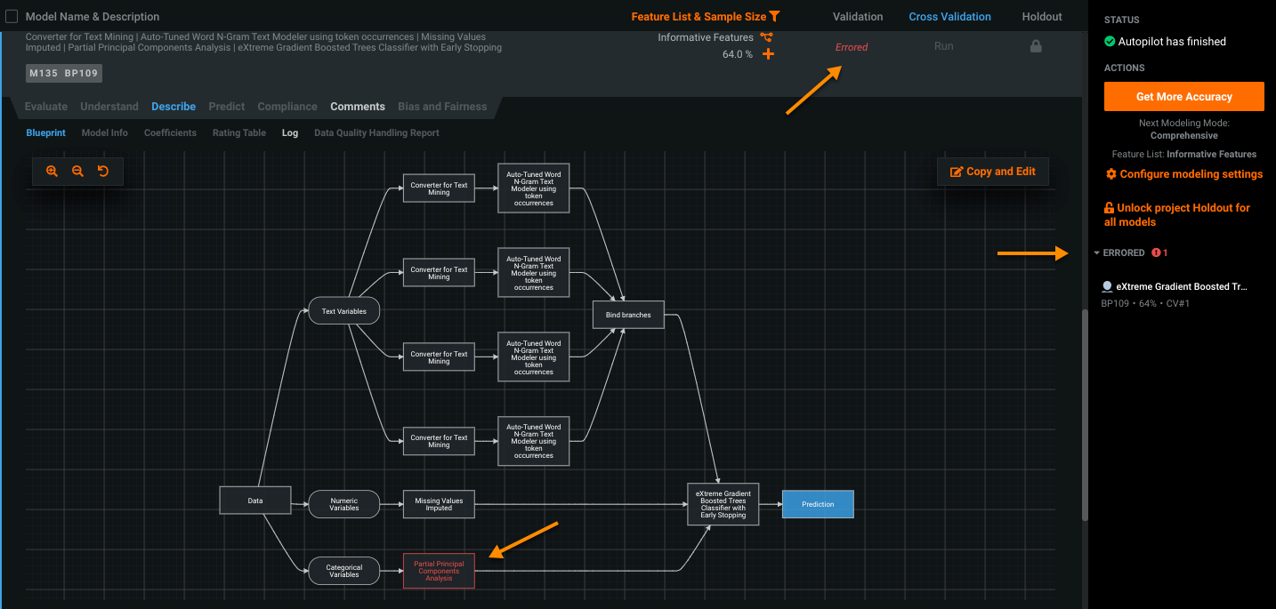The model becomes available to the project on the model Leaderboard. If errors were encountered during model building, DataRobot provides several indicators.