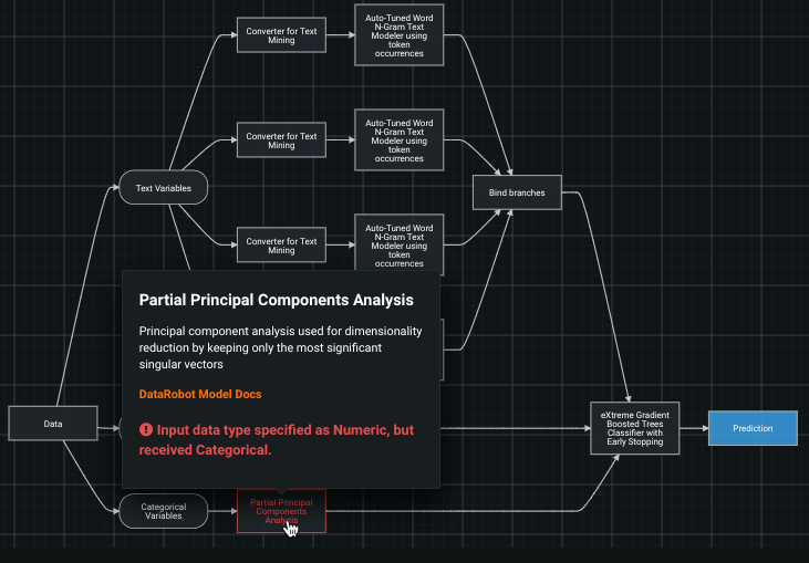 When you create your own blueprints, DataRobot validates modifications to ensure that changes are intentional, not to enforce requirements. As such, blueprints with validation warnings are saved and can be trained, despite the warnings. While this flexibility prevents erroneously constraining you, be aware that a blueprint with warnings is not likely to successfully build a model.