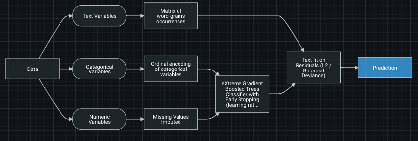 Boosting input: A node that supplies the prediction to boost (eXtreme Gradient Boosted Trees Classifier with Early stopping in the example) and other tasks that pass extra variables of the booster (Matrix of word-grams occurrences).
