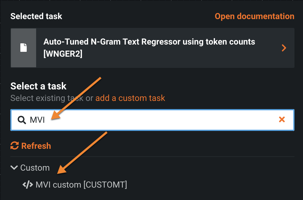 Once the environment is set and the code is uploaded, close the tab. From the Select a task modal, click Refresh to make the new task available. You can find it either by expanding the Custom dropdown or searching: