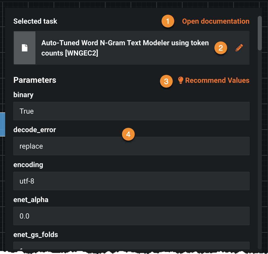 Element Click to... 1 Open documentation link Open the model documentation to read a description of the task and its parameters. 2 Task selector Choose an alternative task. Click through the options to select or search for a specific task. To learn about a task, use the Open documentation link. 3 Recommended values Reset all parameter values to the safe defaults recommended by DataRobot. 4 Value entry Change a parameter value. When you select a parameter, a dropdown displays acceptable values. Click outside the box to set the new value.