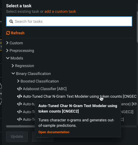 When you click to select a new task, the blueprint editor loads that task's parameters for editing (if desired). When you are finished, click Update. DataRobot replaces the task in the blueprint.