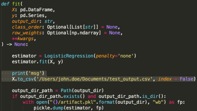 print(msg)into one of the methods; when running a task usingdrum fit, DataRobot will print the message in the terminal. - Write intermediate or final results into a local file for later inspections, which could help to confirm that a custom task works as expected.
