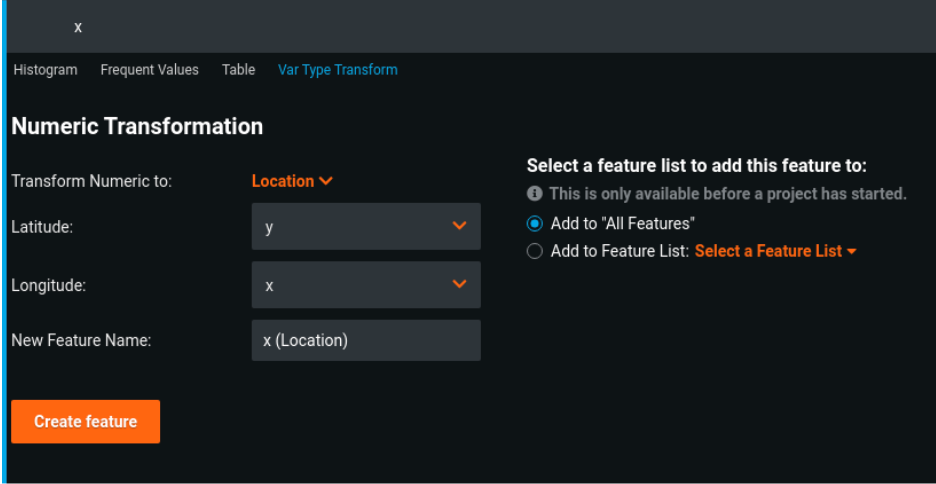 When spatial coordinates embedded in non-geospatial file formats are not recognized, you can still use DataRobot variable type transform functionality to create a location feature. To transform data into a location feature: