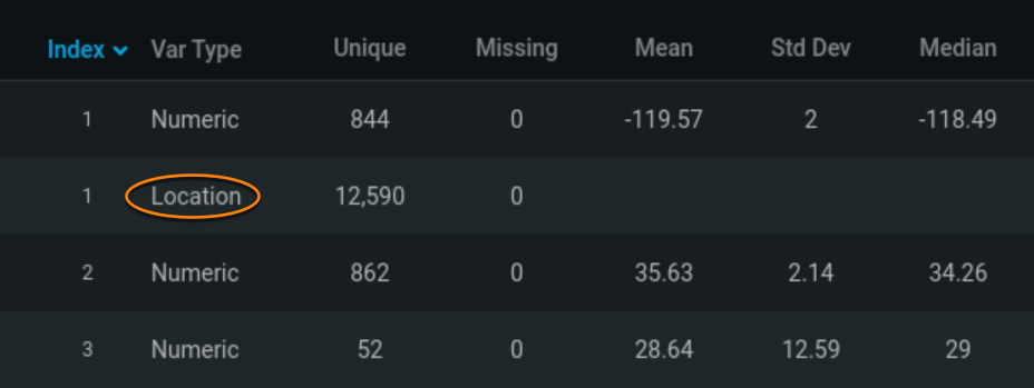 In addition to the traditional variable types of numeric, categorical, and date, Location AI adds a location variable type to provide explicit treatment of spatial data in DataRobot models.