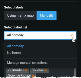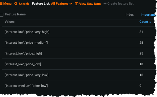 Labels are not mutually exclusive; each row can have many labels, and many rows can have the same labels. From the Data page, view the top 30 unique label sets in a multicategorical feature: