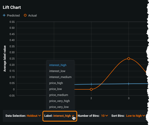 Use the Lift Chart to compare predicted versus actual values of the multilabel target. It functions and provides the same selectors as the binary Lift Chart, with the addition of the ability to select the desired label: