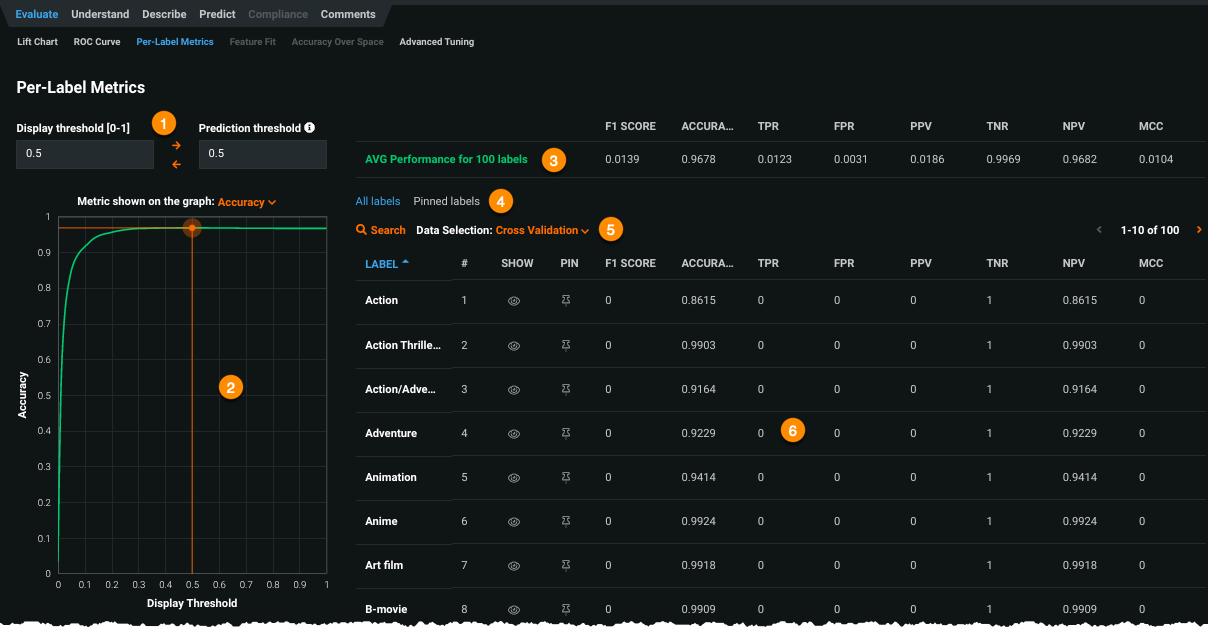 - Displays average and per-label model performance, based on the prediction threshold, for a selectable metric.