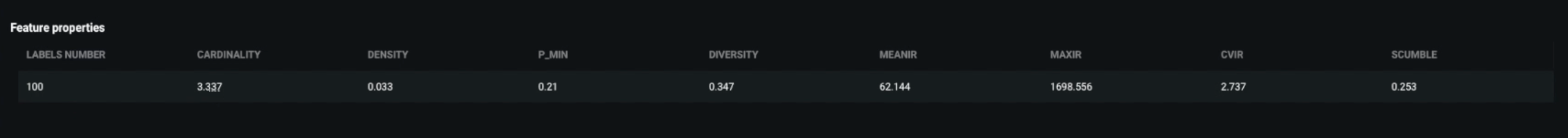 The Feature Properties statistics report provides overall multilabel dataset characteristics.