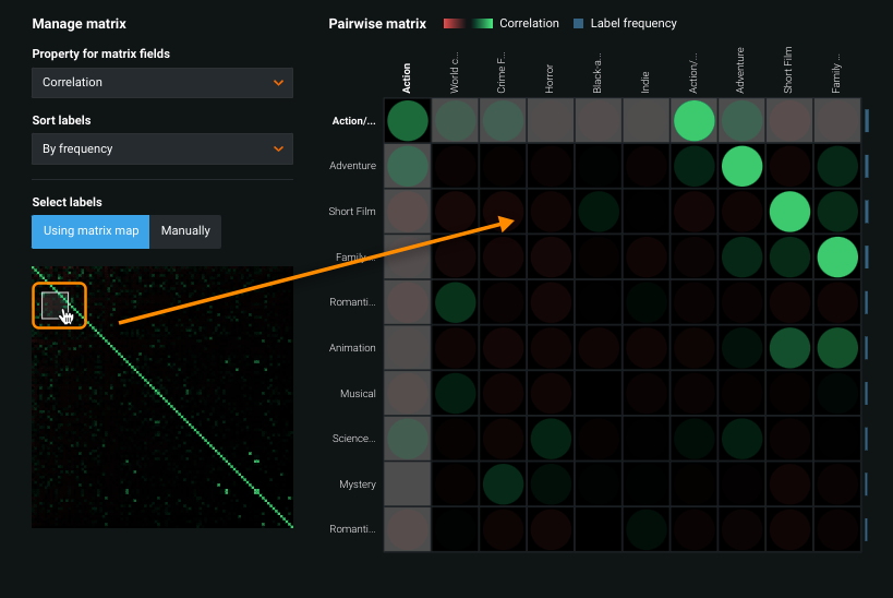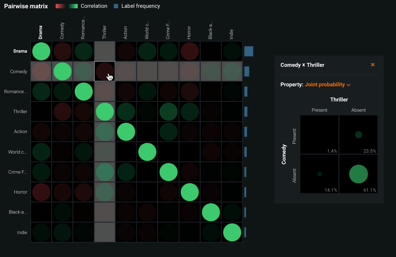 The pairwise matrix shows pairwise statistics for pairs of labels and the occurrence percentage of each label in the dataset. From here you can: