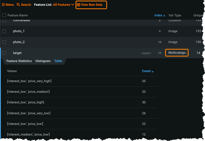 - From the Data page, find a multicategorical feature (search if necessary) and select it as the target.