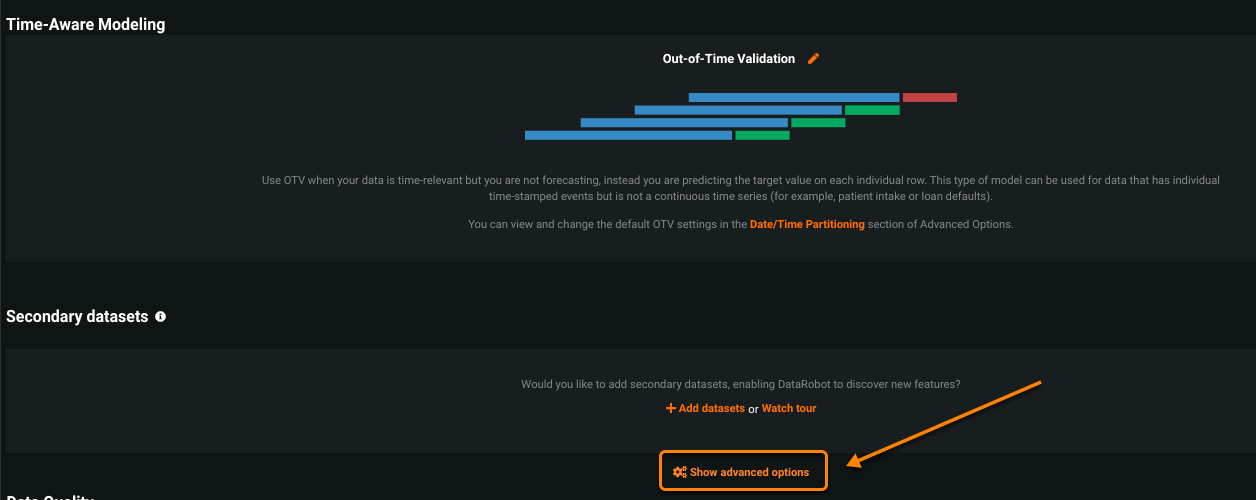 To activate time-aware modeling, your dataset must contain a column with a variable type “Date” for partitioning. If it does, the date/time partitioning feature becomes available through the Set up time-aware modeling link on the Start screen. After selecting a time feature, you can then use the Advanced options link to further configure your model build.