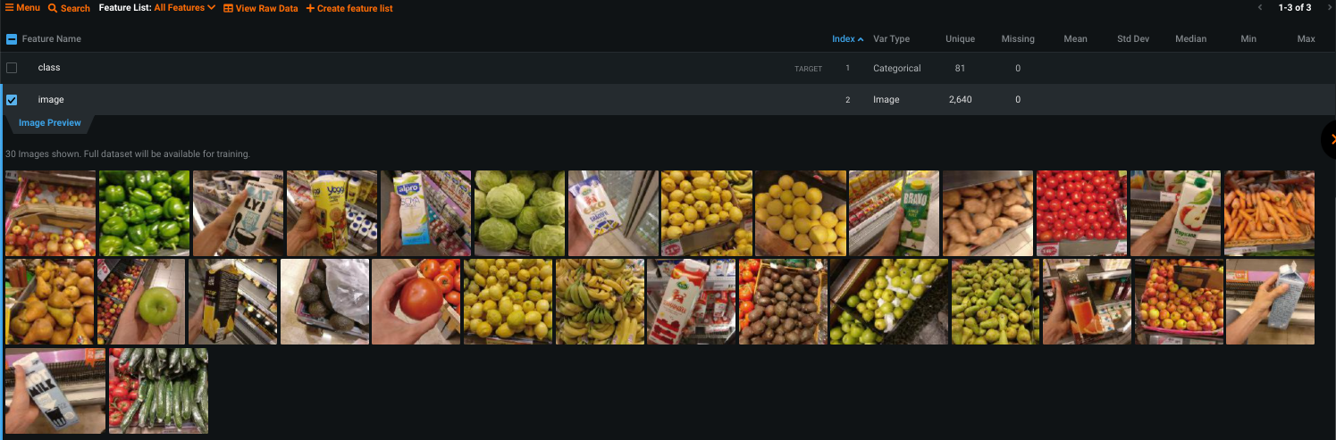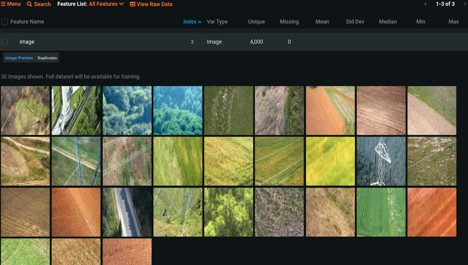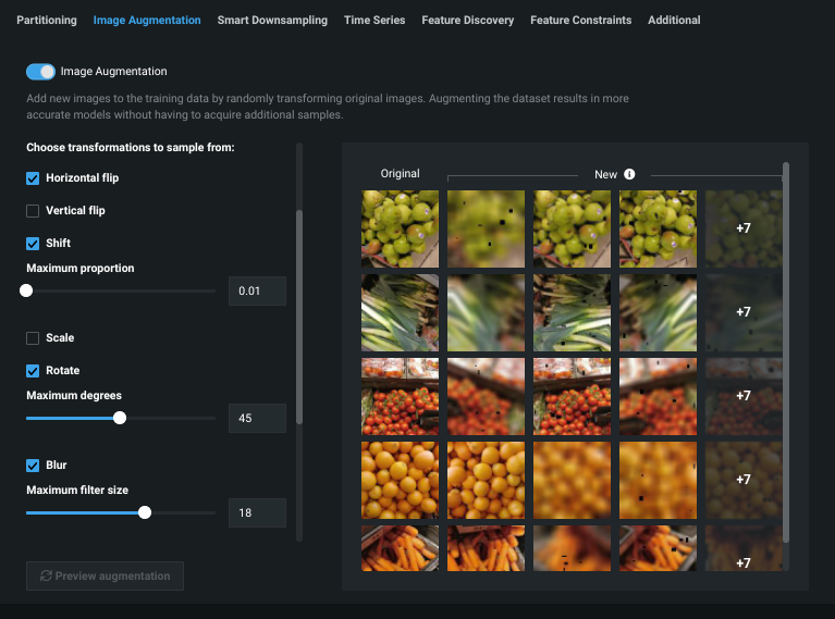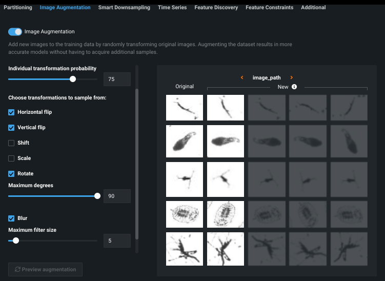 Below are some example use cases to help illustrate how you might leverage domain knowledge of your dataset to craft a beneficial augmentation strategy. You can try the suggestions and then modify the settings using the Advanced Tuning tab. For each, the first screenshot explores the images by expanding the image feature in the Data tab. The second shows previews from the Advanced options > Image Augmentation tab.