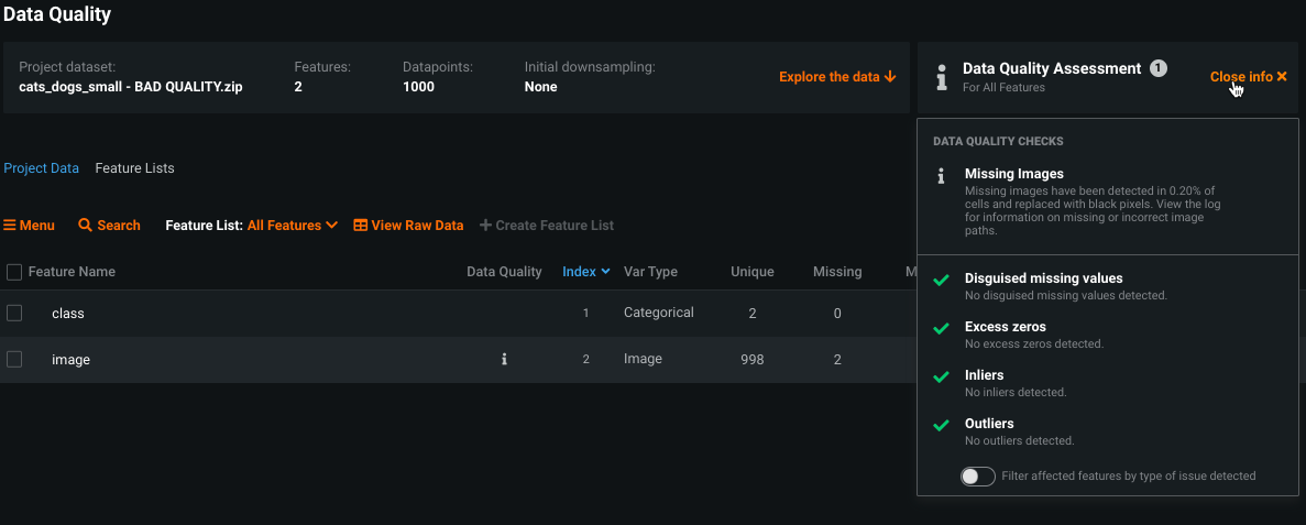 Visual AI uses the Data Quality Assessment tool, with specific checks in place for images. After EDA1 completes, access the results from the Data page: