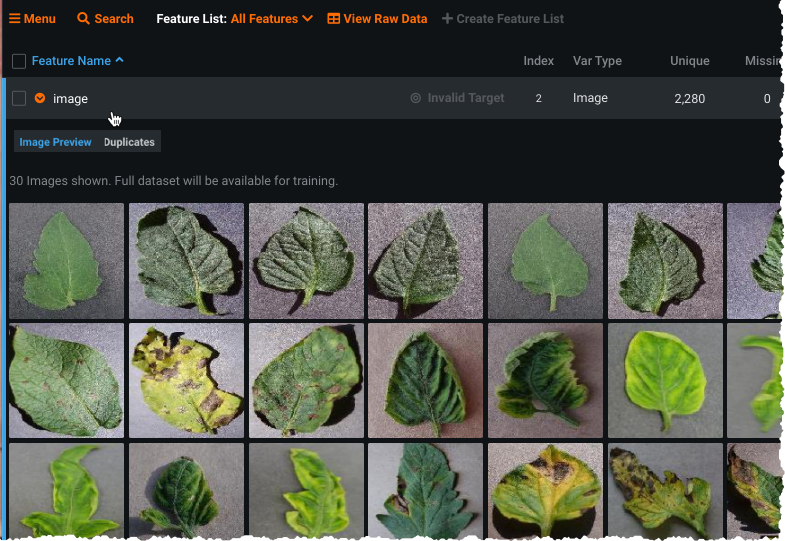 imagerow in the data table to open the image preview, a random sample of 30 images from the dataset (the full dataset will be used for training). The preview confirms that the images were processed by DataRobot and also allows you to confirm that it is the image set you intended to use.