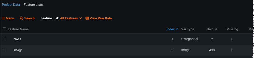 After EDA1 completes, whether initiated from the AI Catalog or drag-and-drop, DataRobot runs data quality checks, identifies column types, and provides a preview of images for sampling. Confirm on the Data page that DataRobot processed dataset features as class and image: