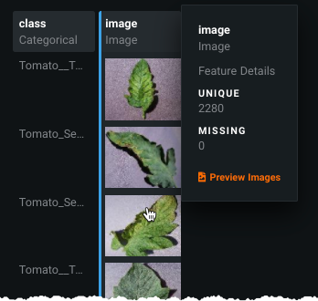 Expand the image feature and click Image Preview. This visualization initially displays one sample for each class in your dataset. Click a class to display more samples for that class: