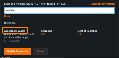 Type a value into the field. Refer to the Acceptable Values field, which lists either constraints for numeric inputs or predefined allowed values for categorical inputs (“selects”). To enter a specific numeric, type a value or range meeting the criteria of Acceptable Values: