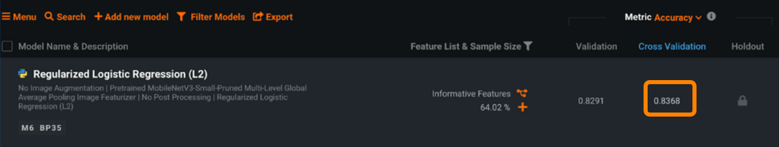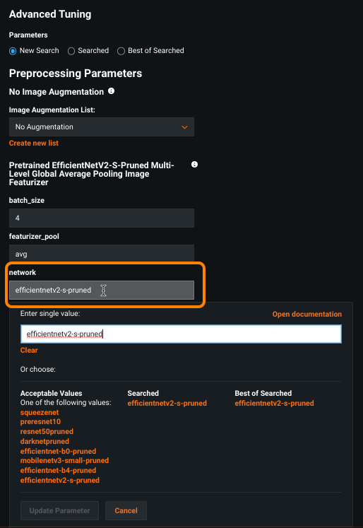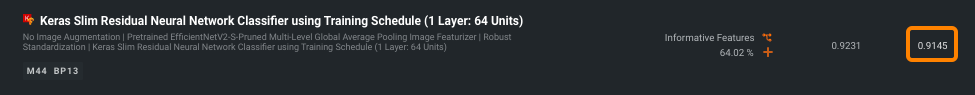 Try different network hyperparameters (scroll to the bottom and select Begin Tuning after each change). After tuning the top Comprehensive mode model with each available image featurizer, you can further explore variations of those featurizers in the top-performing models.