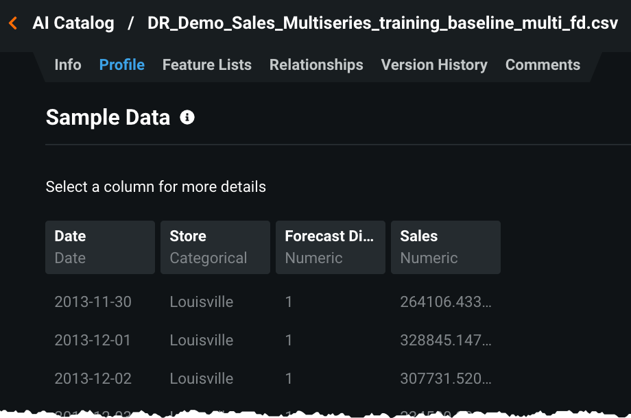Column names must match exactly and the date and series ID columns must match the original data. In this multiseries example, stored in the AI Catalog, each row in this example represents the prediction (the value in the sales column) of a specific series ID (the value in the store column) at a specific date (the value in the date column) with a specific forecast distance (value in Forecast Distance column).