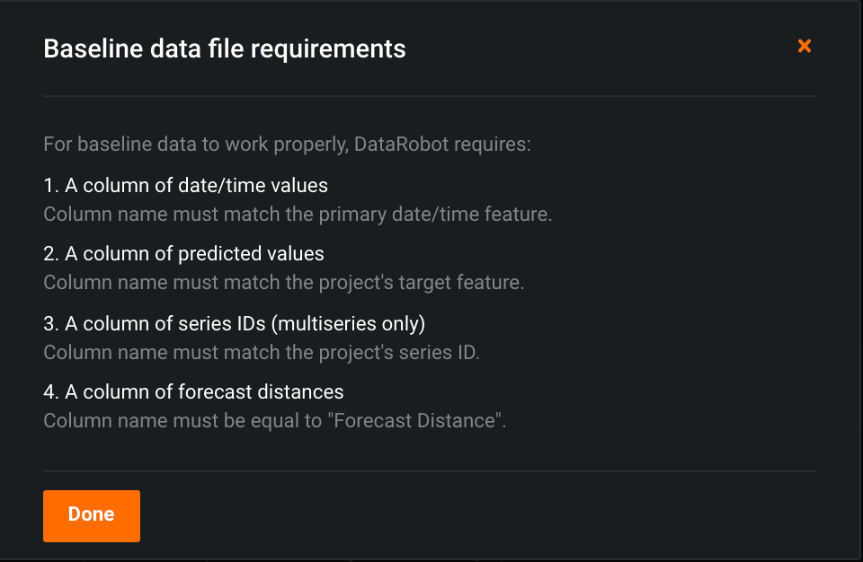 | Date/time values | Column name must match the primary date/time feature. This timestamp refers to the forecast timestamp, not the forecast point. For example, a row with a timestamp Aug 1 and FD = 1, the baseline value should be compared to the Aug 1 actuals (and would have been generated via the baseline model as of July 31). |