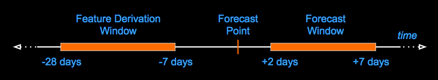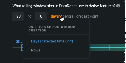 Customize the window settings (Feature Derivation Window (FDW) and Forecast Window (FW)) to configure how DataRobot derives features for the modeling dataset. Before modifying these values, see the detailed guidance for the meaning and implication of each window.