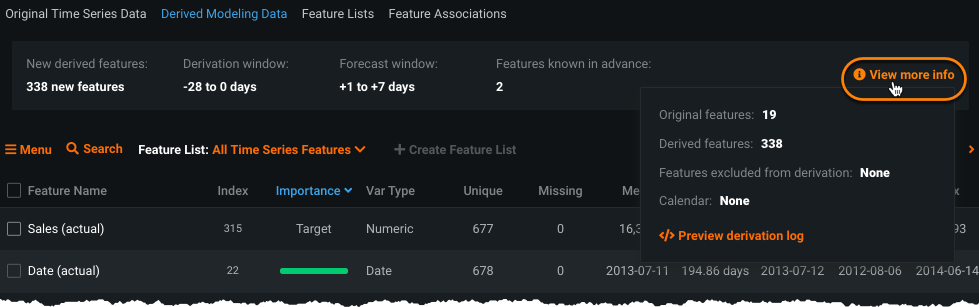 Click View more info for more specific feature generation details, including access to the derivation log.