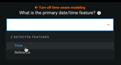 From the dropdown, select the primary date/time feature. The dropdown lists all date/time features that DataRobot detected during EDA1.