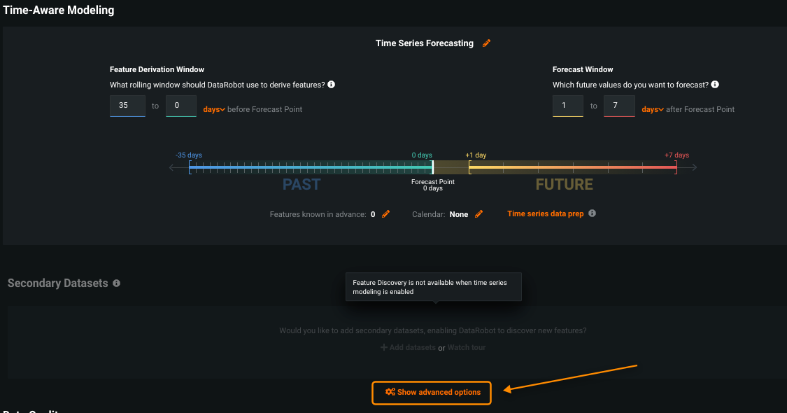 To modify additional settings used for modeling (date/time format, training window, validation length, etc.), scroll down and expand Show advanced options. See the full documentation for more information.