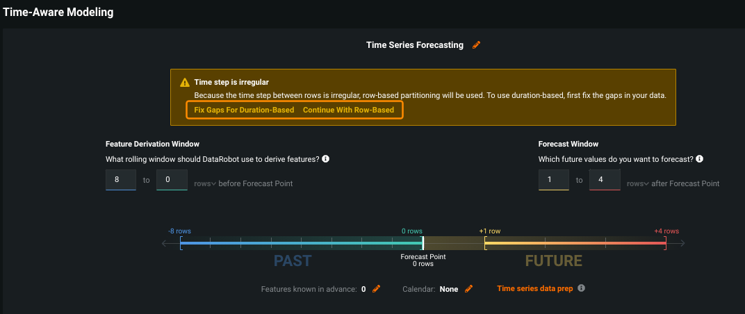 Set the training window format, either Duration or Row Count, to specify how Autopilot chooses training periods when building models. Before setting this value, see the details of row count vs. duration and how they apply to different folds. Note that, for irregular datasets, the setting defaults to Row Count. Use the data prep tool before changing this setting.