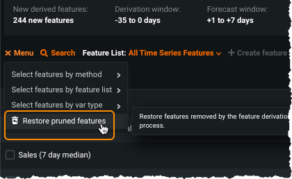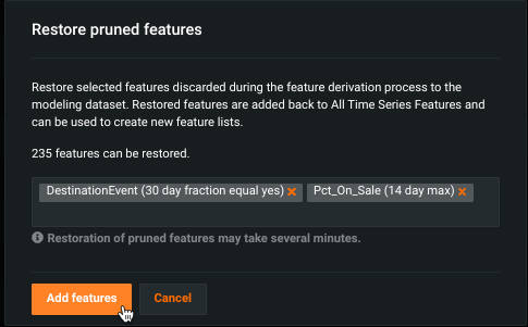 The following describes how to restore removed features (identified from the derivation log) to the modeling dataset. You can use this option repeatedly, until you have restored all features or have reached the maximum supported features, which may be constrained by data ingest limits.