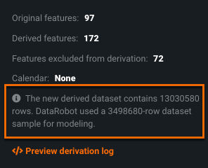 Growth in a time series dataset is based on the number of columns and the length of the forecast window (i.e., the number of forecast distances within the window). The derived features are then sampled across the backtests and holdout and the sampled data provides the basis of related insights (Leaderboard scores, Forecasting Accuracy, Forecasting Stability, Feature Effects, Feature Over Time). DataRobot reports that information in the additional info modal accessible from the Derived Modeling Data panel: