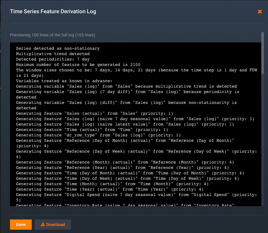 Within the log, you can see that every candidate derived feature is assigned a priority level (Generating feature "Sales (35 day mean)" from "Sales" (priority: 11) for example). When deciding which of the candidates to keep after time series feature derivation completes, DataRobot picks a priority threshold and excludes features outside that threshold. When a candidate feature is removed, the feature derivation log displays the reason: