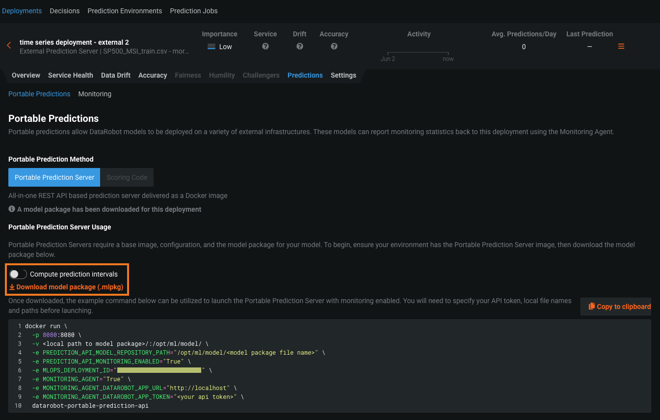To run a DataRobot time series model in a remote prediction environment, you download a model package (.mlpkg file) from the Leaderboard or the model's deployment. In both locations, you can now choose to Compute prediction intervals during model package generation. You can then run prediction jobs with a portable prediction server (PPS) outside DataRobot.
