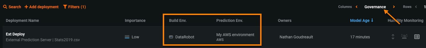 To download a model package with prediction intervals from a deployment, ensure that your deployment supports model package downloads. The deployment must have a DataRobot build environment and an external prediction environment, which you can verify using the Governance Lens in the deployment inventory: