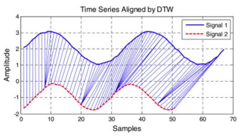 DTW produces a similarity metric between two series by attempting to match the "shapes." The graph below shows an example where the matching between the indices is not 1-to-1—it's warped.