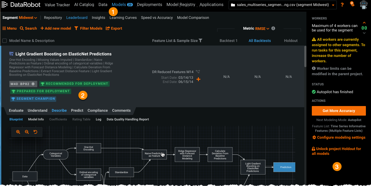 | 2 | DataRobot has recommended a model for deployment and marked a model as champion. |