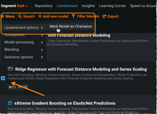 To reassign the champion, from the segment Leaderboard, select the model you want as champion. Then, from the menu select Leaderboard options > Mark model as champion.