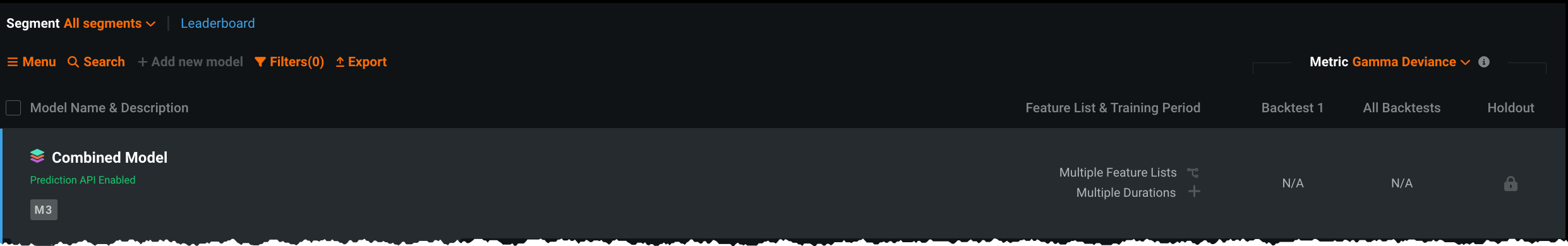 Only one Combined Model on a project's Leaderboard can be the Active Combined Model (marked with a badge).