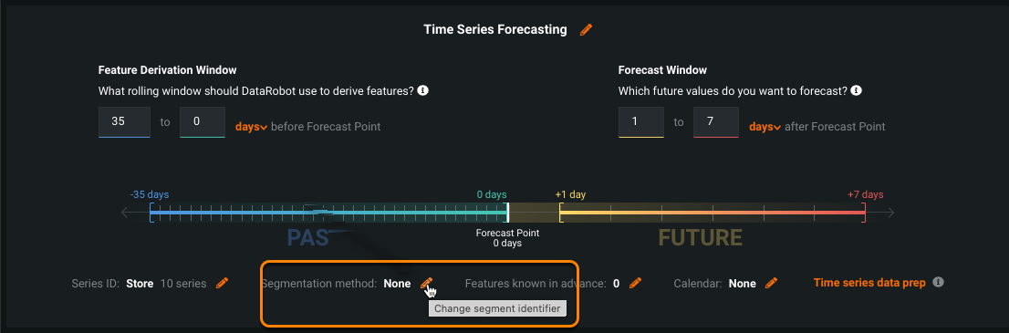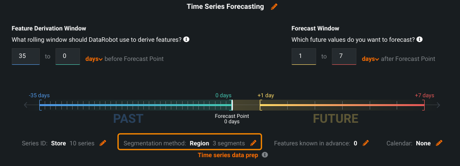 Time series segmented modeling requires, first, defining segments that divide the dataset. To define segments, you can allow DataRobot to:
