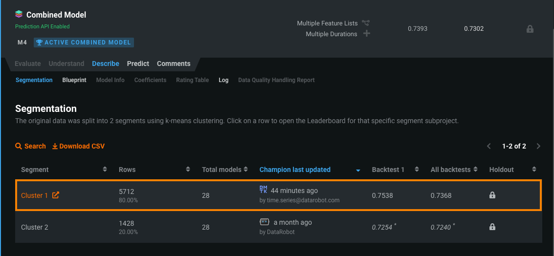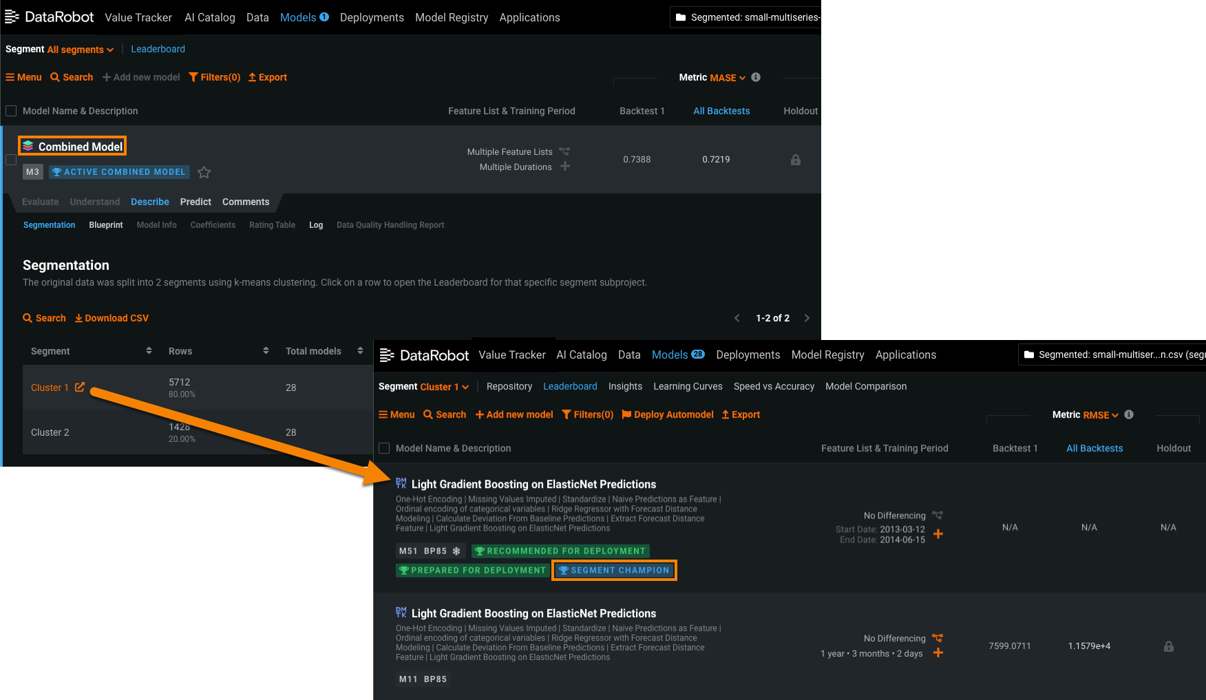 The Combined Model is comprised of one model per segment—the segment champion. The individual segments, on the other hand, comprise a complete project. You can investigate the project from the segment's Leaderboard and even deploy a segment model, independent of the Combined Model.