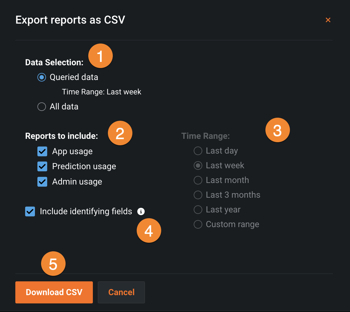 | Time Range (4) | Limits the number of records shown in the preview (previous year of records by default). You can select one of the predefined time ranges or specify a custom time range using the date picker*. (See restrictions when previewing the Prediction Usage activity report.) |