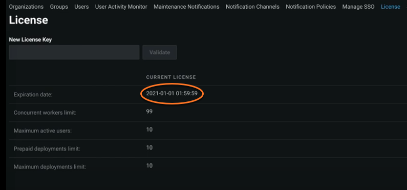 Expand the profile icon located in the upper right and click License. The page shows license details, including expiration date, concurrent workers limit, maximum active users, prepaid deployment limit, maximum deployment limit, and in some instances, subscription features: