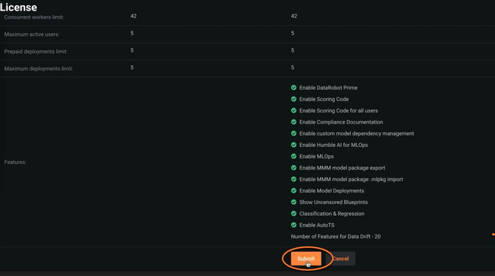 If your license expires before applying the new license, users continue to have access to DataRobot and can make predictions using existing models. They cannot build new models or new insights or generate Compliance Documentation; existing elements are still available in the UI, however. If model building (EDA2) is running for a project when the license expires, the current round finishes.