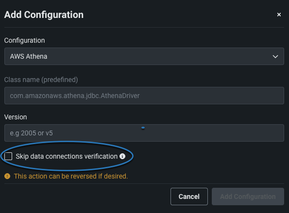 If there are existing connections to the driver and the new configuration will affect the JDBC URLs (and you still want to make this change), select Skip data connections verification. This ensures DataRobot does not validate JDBC URLs for existing data connections.