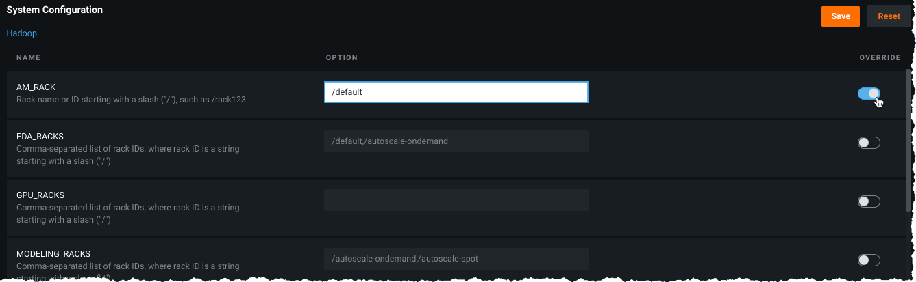 Change the OPTION field to the desired value and click SAVE. The system immediately updates to use the new configuration value across the application (and the toggle remains on).