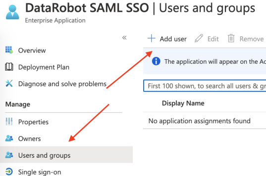 To make sure the test account has access to the application, open Users and groups in the left-hand navigation and click Add user.