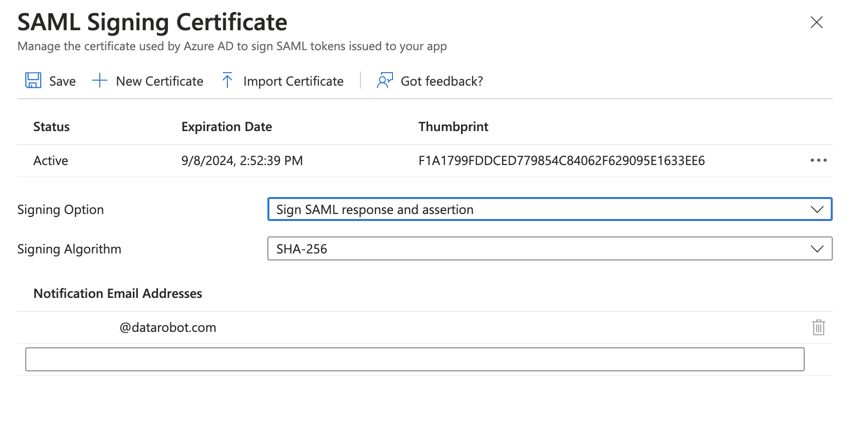 | Certificate | The X.509 certificate, pasted or uploaded. Certificate is used for validating IdP signatures. This is obtained from the SAML application you created for DataRobot in the IdP configuration. |