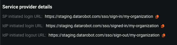 To retrieve this information in DataRobot, go to /admin/organizations/manage/<org_id>/sso and locate Service provider details, which lists URL details.