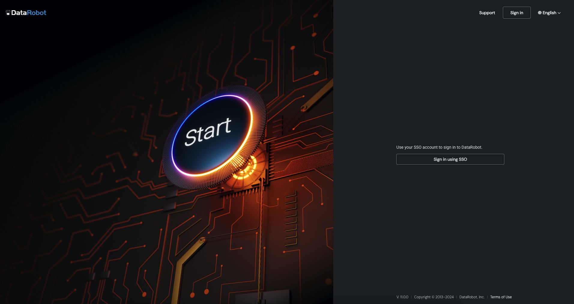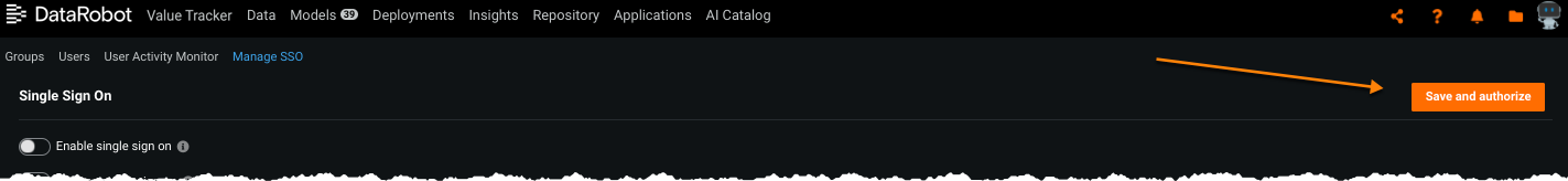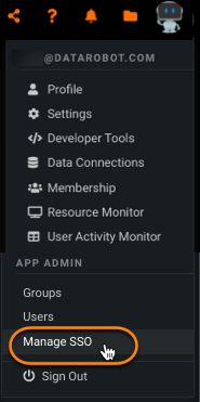Availability of single sign-on (SSO) is dependent on your DataRobot package. If it is not enabled for your organization, contact your DataRobot representative.